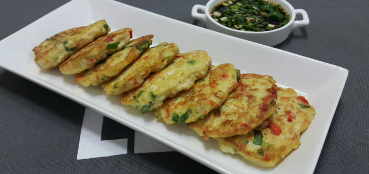 이 반죽은 겉은 바삭하고 속은 부드러운 식감을 잘 유지할 수 있도록 만들어 줘요. 부침가루 대신 밀가루를 써도 되지만, 부침가루에는 감자전분이 들어 있어서 더 바삭하게 부쳐져요.